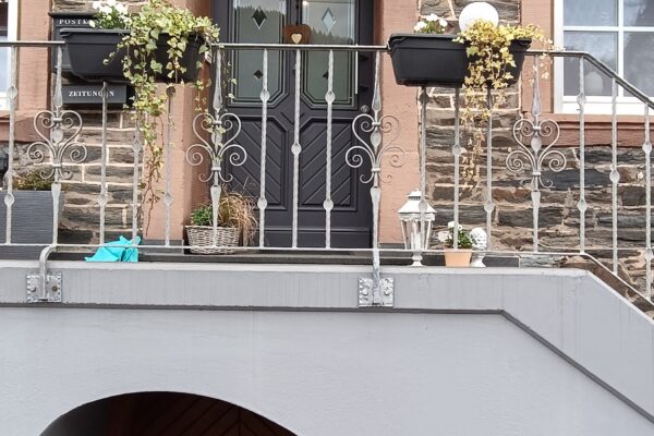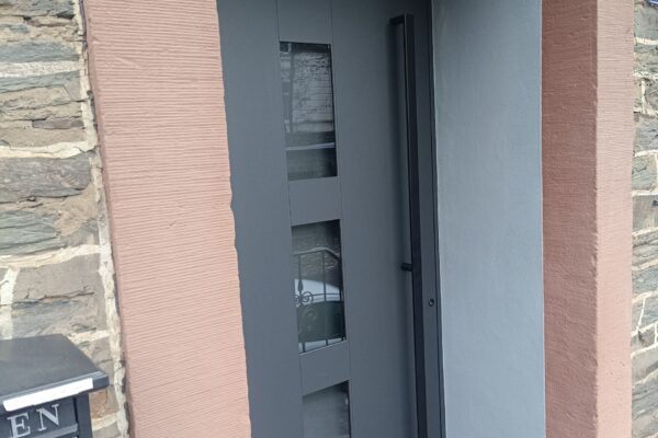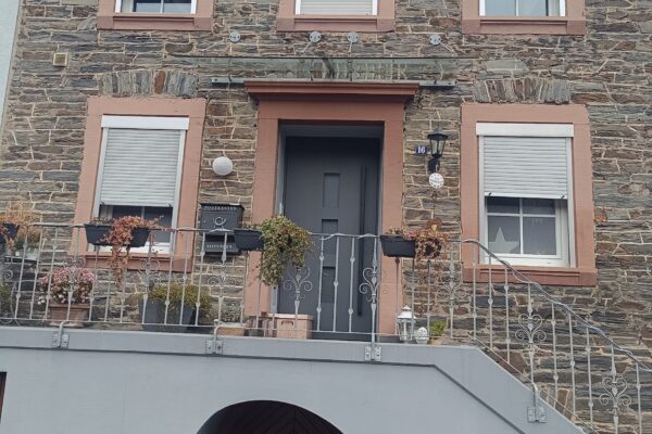 In einem charmanten Winzerhaus in Traben-Trarbach wurde eine alte Holzhaustür ausgebaut und durch eine hochwertige Groke Aluminiumhaustür ersetzt. Die neue Tür überzeugt mit Einbruchschutzklasse RC2 sowie eleganten schwarzen Beschlägen und Griffen – ein echter Hingucker.